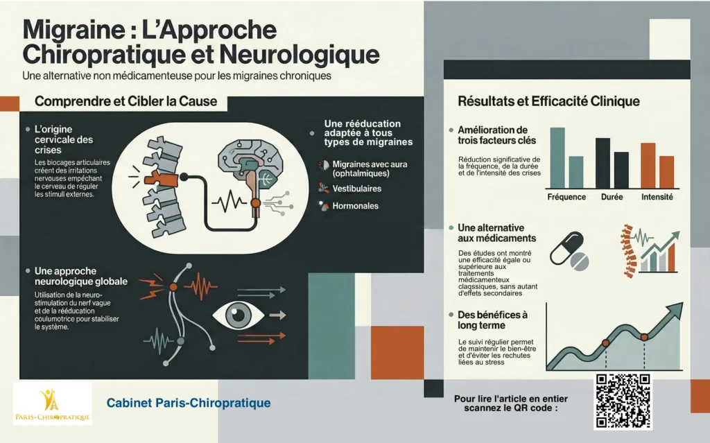 Les migraines, avec ou sans aura, peuvent profondément altérer la vie quotidienne. À Paris Chiropratique, nous proposons une prise en charge personnalisée combinant la Chiropraxie à la neurologie fonctionnelle et visant à réduire les irritations nerveuses cervicales, et à stimuler le système nerveux pour l’aider à mieux gérer les facteurs déclenchants de la migraine et donc diminuer la fréquence et l’intensité des crises.